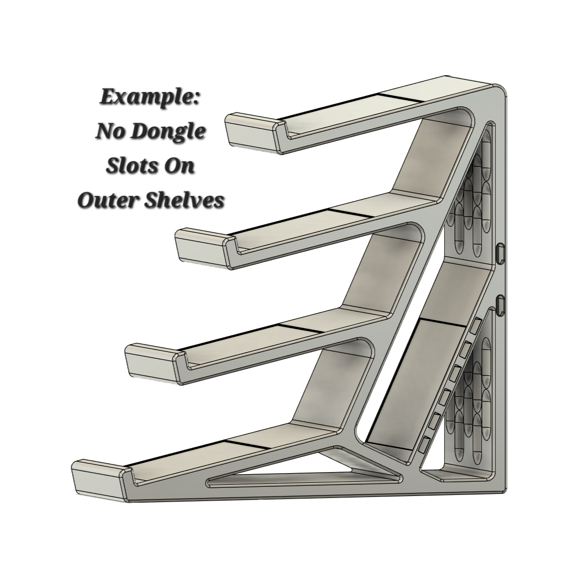 Each stand has a total of 28 USB dongle slots for storage. There are two per side on each shelf, so 4 total per shelf. The internal shelf has 6 on each side, so 12 total on the internal shelf. Dongle slots have been designed to fit dongles snug so they are unlikely to fall out.