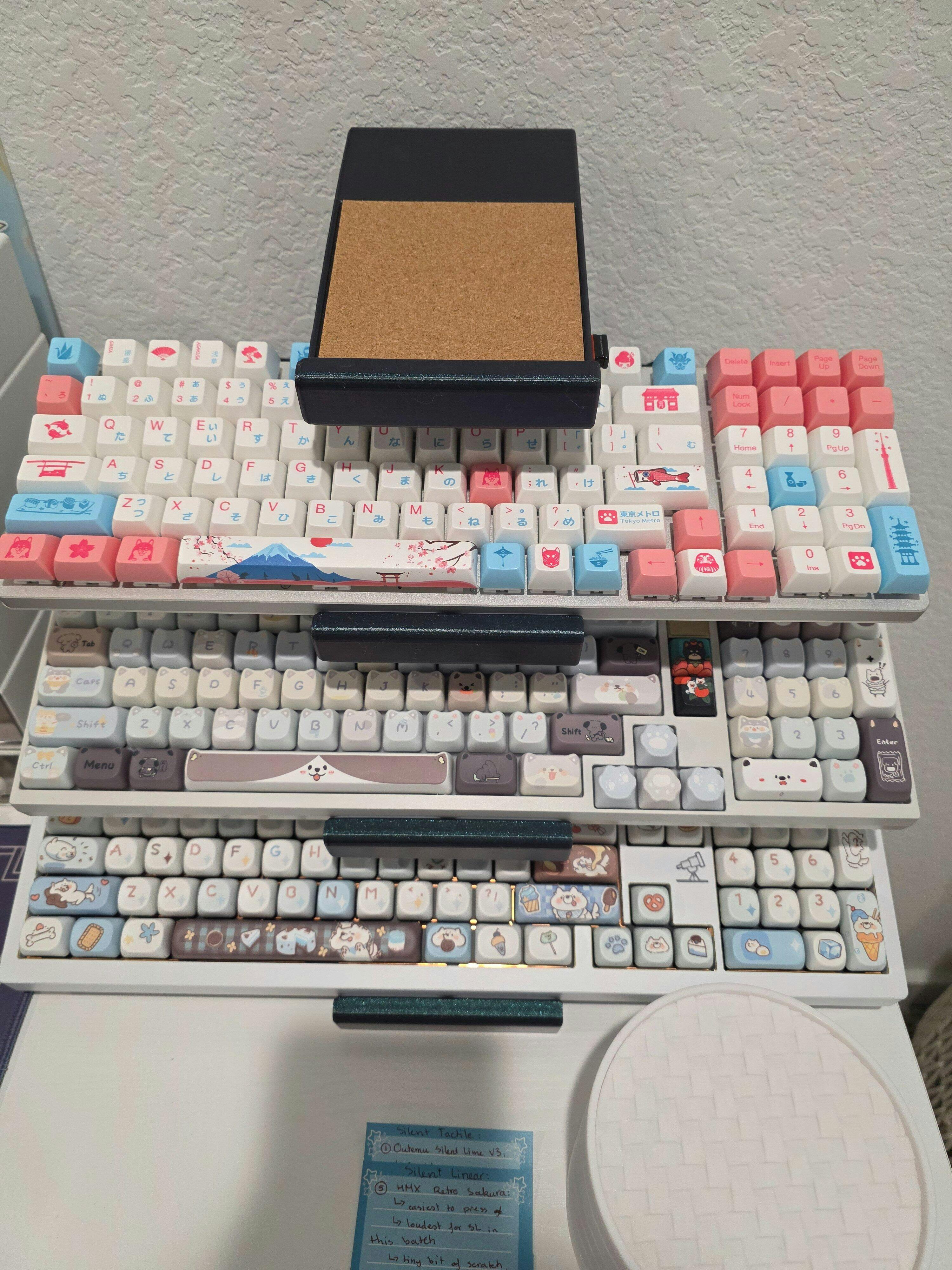 Love this keyboard stand, one station that holds all. Many slots for USB dongle. The cork surfaces and feet cushions to protect the keyboard are truly a bliss. The color is perfect too, metallic finish is lovely. It is extremely sturdy. Even the back has slots to hang cables. I don't have any smaller keyboards, so i used the vertical space to store my ipad and it fits perfectly inside. I appreciate every detail that went into making this stand. I think it is definitely worth EVERY PENNY and will come back to purchase another.