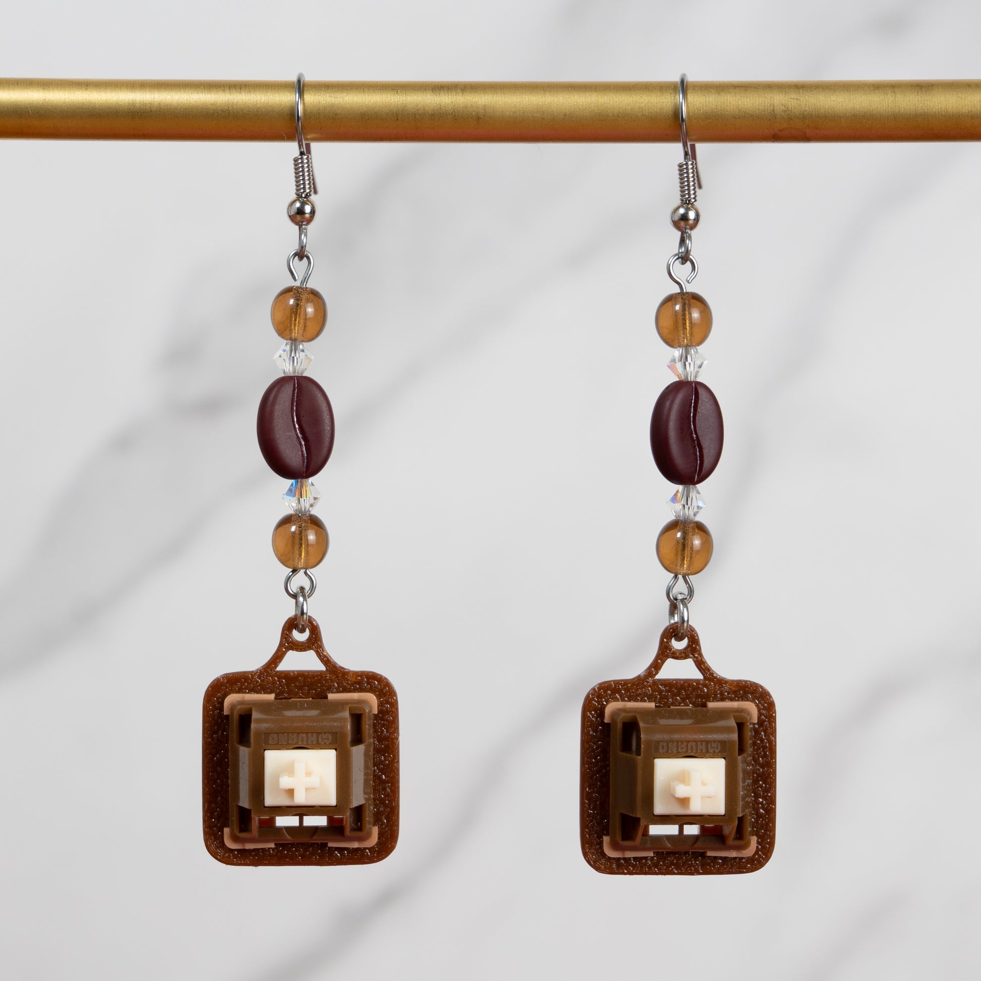 Add a touch of iced-coffee charm to your look! These handmade earrings feature Huano Caramel Latte mechanical switches paired with coffee-inspired glass beads for a cozy, café aesthetic.