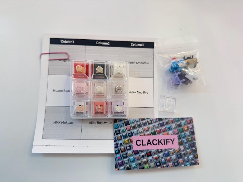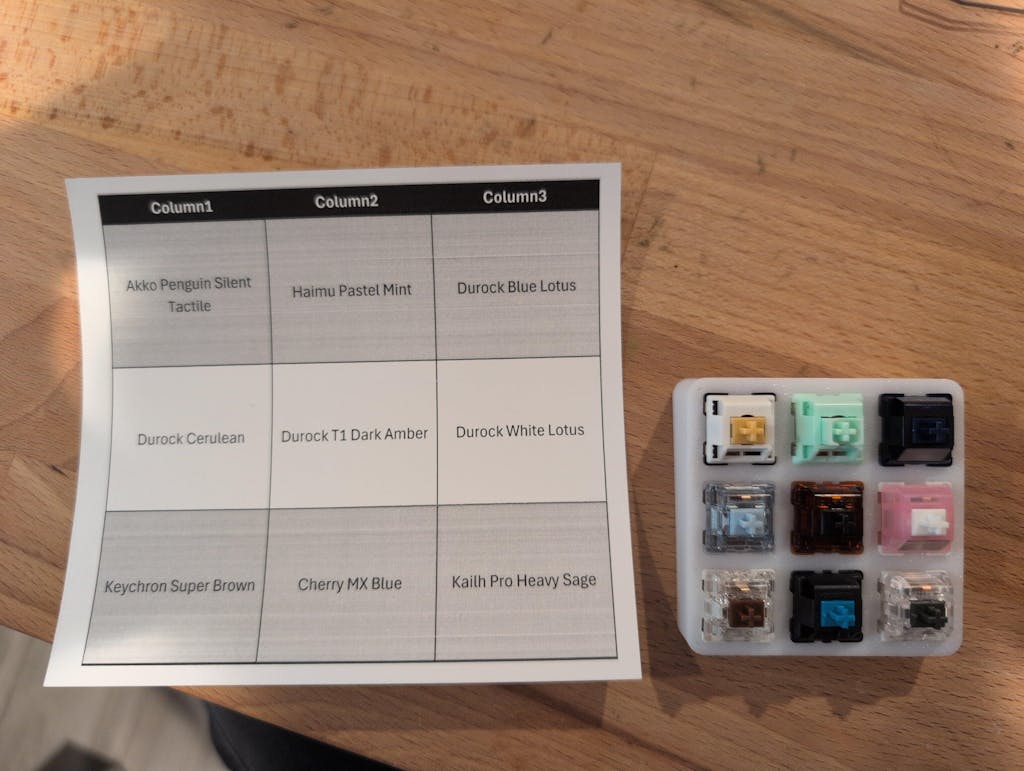 Highly recommend this switch tester! It was well-packaged with a handy chart showing where each switch was. The 3D-printed base is good quality and helped emulate a real keyboard in terms of sound. The clear keycaps (not pictured here) are really nice for seeing the switches. The seller also included some extra switches that seemed to be chosen based on what I ordered and what the seller recommends - one of them ended up being my favorite of the bunch!